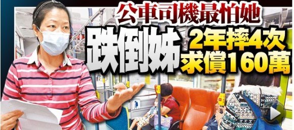 台湾一名让公交车司机闻之色变的“跌倒姐”,只要一上车,公交车就立刻变得龟速前进,司机们不敢怠慢这名“贵客”,深怕踩重油门或突然煞车,让她稍有闪失,就得要官司缠身,目前已有4名公交车司机,被她以“开快车”害她及家人跌伤提告,索赔30万至100万元(新台币 下同)不等,其中最密集的是两天竟连告两起,以致公交车司机一看到她都超紧张。