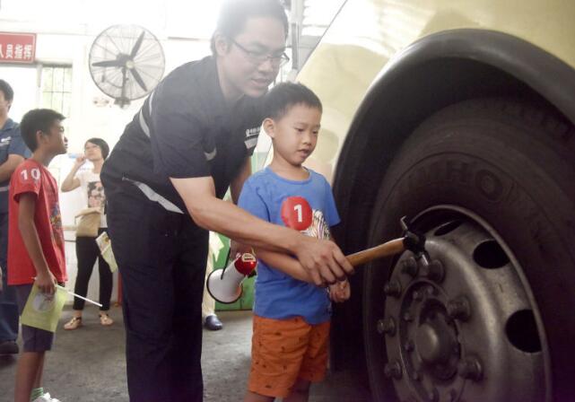 在二汽维修事业部,工作人员为小朋友们现场展示了换装轮胎,并邀请小朋友亲自检验螺丝是否上紧。据工作人员介绍,由于广州市民公交出行需求很大,所以这些庞然大物经常处于超负荷运载的状况,每 25 天就要做一次一级保养。而这个维修车间有 50 名技工,每天三班倒 24 小时不停歇。每个月里,该车间要为 300 台公交车做一级保养,60 台车做二级保养。