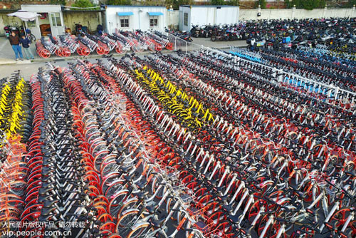 2017年3月1日,航拍上海制造局路各种被“扣押”的共享单车,色彩丰富若“彩虹”,其中光摩拜单车就超过了3500辆,其他共享单车接近500辆。