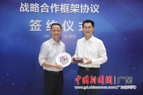 腾讯公司董事会主席兼首席执行官马化腾与深圳巴士集团董事长余钢互换礼物