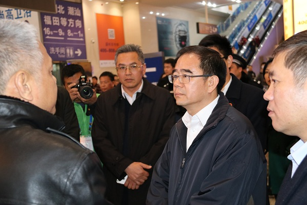在虎门高铁站,梁维东市长一行先后检查站前广场、公交站场交通疏导情况及售票大厅、候车室客运组织情况,听取高铁站相关负责人介绍春运运力组织、安保措施、应急准备等情况。在经过旅客安检机时,梁维东市长驻足询问安检落实情况,当听到旅客进站所有行包必须经过安检,确保所有危险物品不被携带上车,同时对车票及身份证进行一一比对检查时,梁维东市长表示肯定。在乘客候车厅,梁维东市长要求各部门通力合作,千方百计确保旅客出行安全有序,让旅客平安开心回家过年。特别是要充分做好安保工作、交通疏运、临时安置等重点环节的应急预案,确保发生因恶劣天气造成列车延误、旅客滞留时,能第一时间维持好站场秩序,及时通过应急车辆将旅客疏运到应急安置点,应急安置点要准备足够的饮用水、食物、御寒衣被等,要确保应急安置点安全、卫生。梁维东市长结束视察离开虎门高铁站之际,代表市委市政府向坚守春运一线的执勤人员、工作人员、志愿者及广大旅客致以了节日问候,并向大家拜个早年。