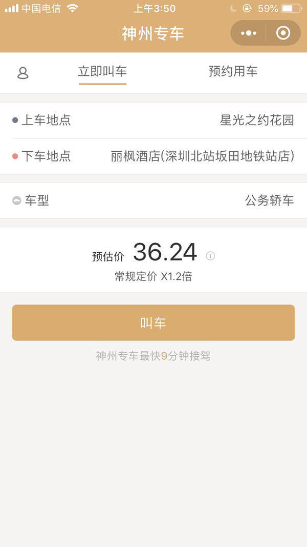 深圳,记者使用神州专车叫车的预估价格。澎湃新闻记者 赵孟 图
