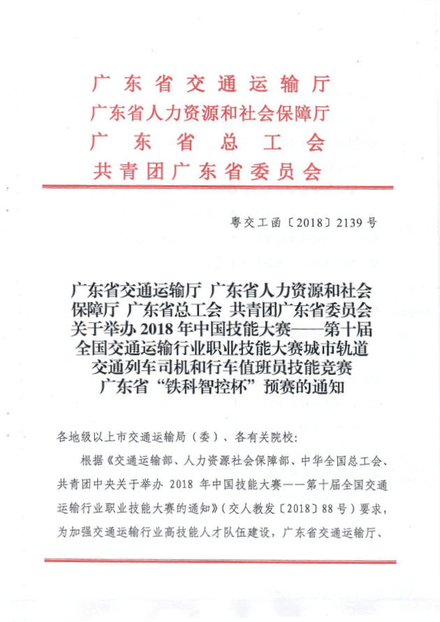 广东省交通运输厅 广东省人力资源和社会保障厅 广东省总工会 共青团广东省委员会 关于举办2018年中国技能大赛——第十届全国交通运输行业职业技能大赛城市轨道交通列车司机和行车值班员职业技能竞赛广东省“铁科智控杯”预赛的通知
