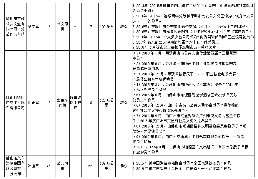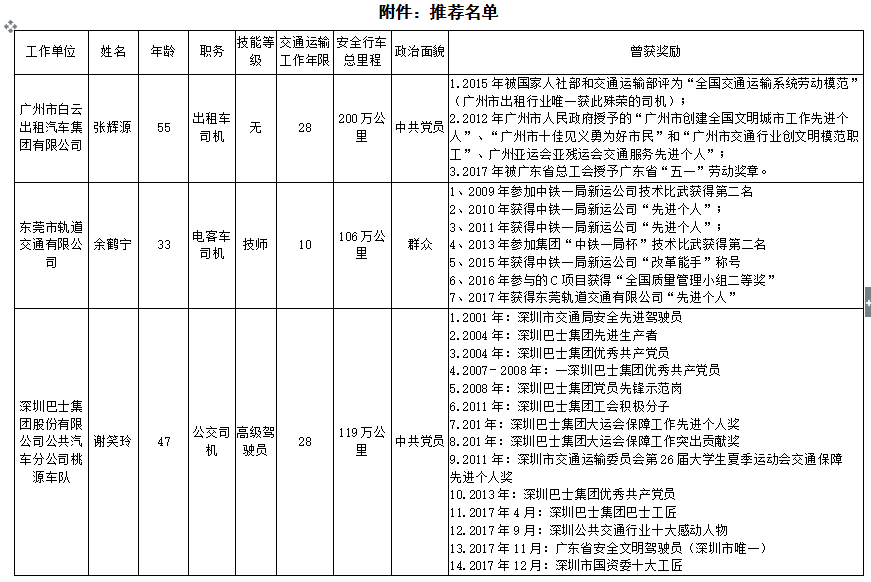 根据《广东省交通运输厅 广东省总工会关于开展“感动交通人物--优秀驾驶员”推选活动的通知》(粤交政〔2018〕604号)要求,我会收集了各会员单位推荐的材料,经审核,最终确定6名拟向活动组委会推荐的名单,现将推荐名单在广东城市公交网(www.gdcsgj.com)进行公示(名单见附件)。公示期:2018年10月9日-14日,公示期如有意见请向本会反馈。