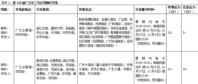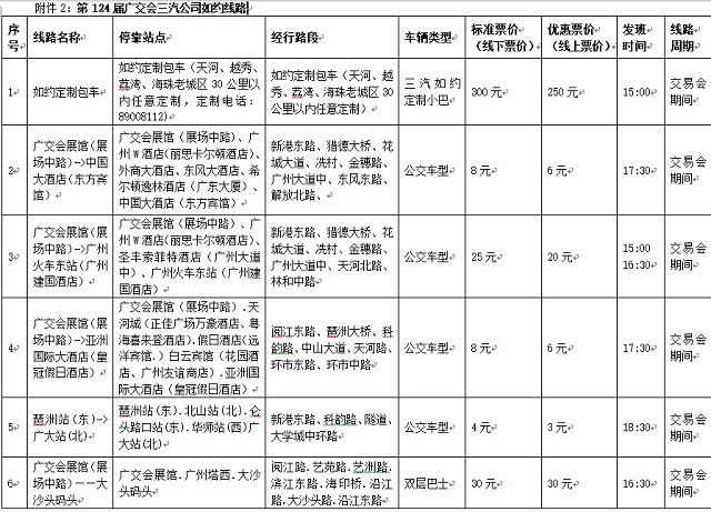 据悉,三汽公司在本届广交会期间重点为参会人员提供各类型的如约巴士服务,具体包括:依托广交会临时商务专线,开行广交会展馆到各酒店之间的如约巴士线路;为高校兼职学生提供广交会展馆与大学城之间的如约巴士服务;提供如约定制包车服务,为客商提供广交会展馆到市区30公里以内任意地点的往返交通;根据客户需求,开行广交会展馆至交通枢纽(广州东站、广州南站)的如约巴士线路;开行广交会展馆到大沙头码头如约巴士线路与2条观光巴士线路实现无缝接驳,实施“一票制”,线路之间可免费接驳换乘。