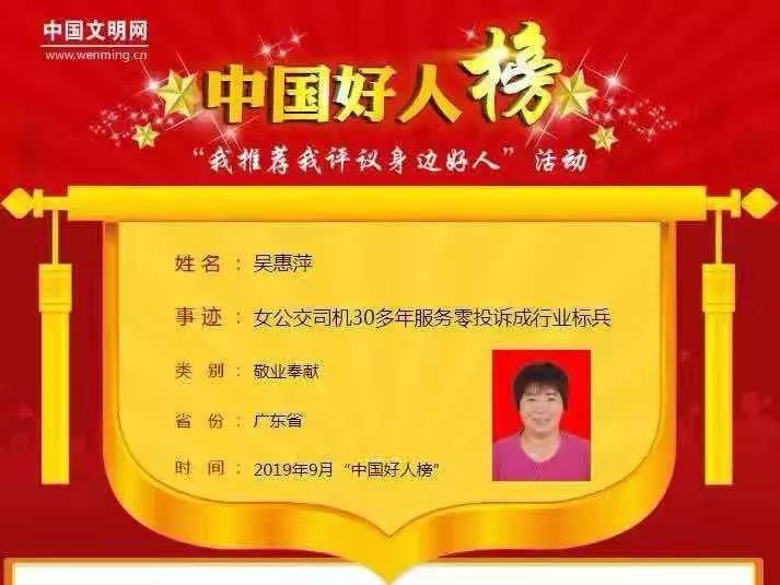 广东省内共有5位好人上榜,其中广东交通集团所属佛山粤运公交111线班长、“广东省五一劳动奖章”获得者吴惠萍获评敬业奉献好人。她也是广东国资系统唯一入选者。