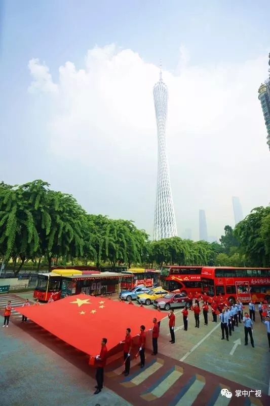 9月26日上午,“我和国旗同框——广州市公交车出租车万车挂国旗迎国庆”活动在珠江帝景苑公交总站正式启动。庆祝新中国成立70周年的主题双层巴士装扮一新,悬挂国旗的红色、蓝色、黄色出租汽车整齐排列,车阵中五星红旗在蓝天白云的映衬下,熠熠生辉。驾驶员组成“70”字样,精神抖擞地手持国旗高声合唱《我和我的祖国》。活动也吸引了很多市民乘客驻足拍照。有市民表示很开心:“比如坐公交车,看到这么喜庆,人也更开心。我们祖国会越来越好,大家生活会越来越好。”