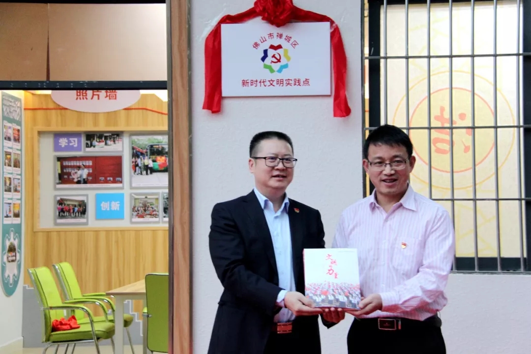 佛山粤运公交党委副书记、副总经理周俊巍(左)接受区委宣传部赠书同时佛山市禅城区委宣传部副部长黄连教也宣布“佛山粤运公交新时代文明实践联建工作站”正式启用。