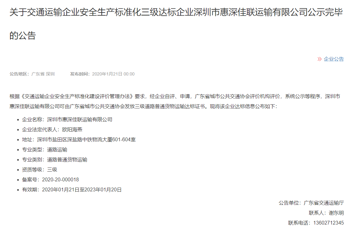 关于交通运输企业安全生产标准化三级达标企业深圳市惠深佳联运输有限公司公示完毕的公告