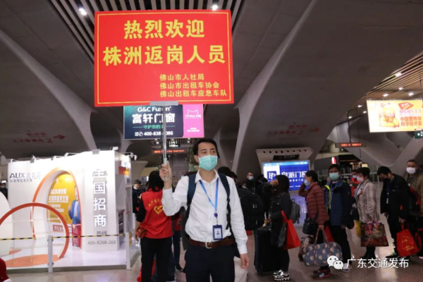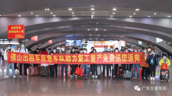 3月15日18点,佛山市出租车应急服务车队20辆出租已列队等候返岗人员的到来,佛山市出租车协会党支部志愿工作者来到返岗人员专列出口4号站台出口处,高举欢迎牌迎接返岗人员。