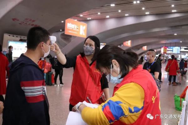 身份查对、测量体温、派发防护用品,安排乘车等系列工作有条不紊进行,志愿者工作人员还为有需要的乘客搬送行李物品。