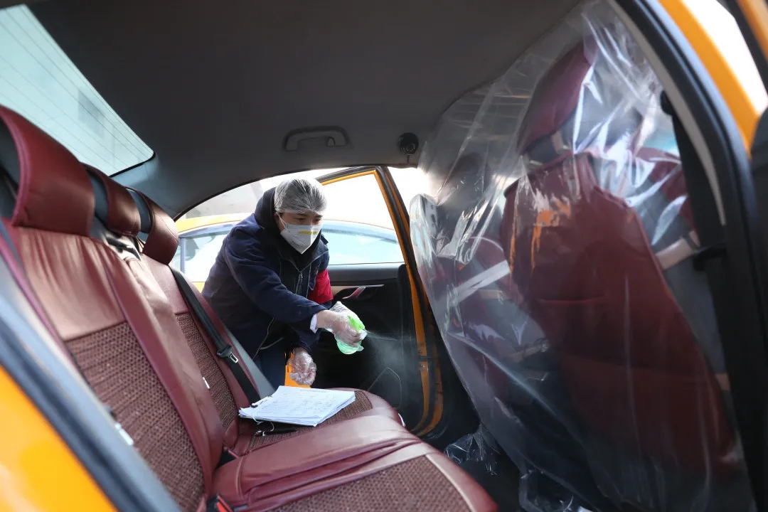 出租汽车司机为车辆消毒,保障乘客安全。