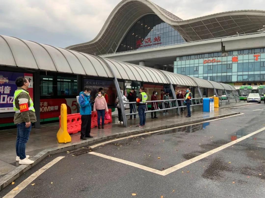 当天下午四点钟,记者赶到高铁武汉站公交枢纽站,只见场站内停有540、118、297、382等十条公交线路,来乘公交的市民并不是很多,所有的站台都用水码和警戒线进行了隔离,引导乘客排队乘车。当有乘客出现间隔距离小的现象时,戴有红袖章的安全员会主动上前进行劝导,让乘客保持足够安全的距离。