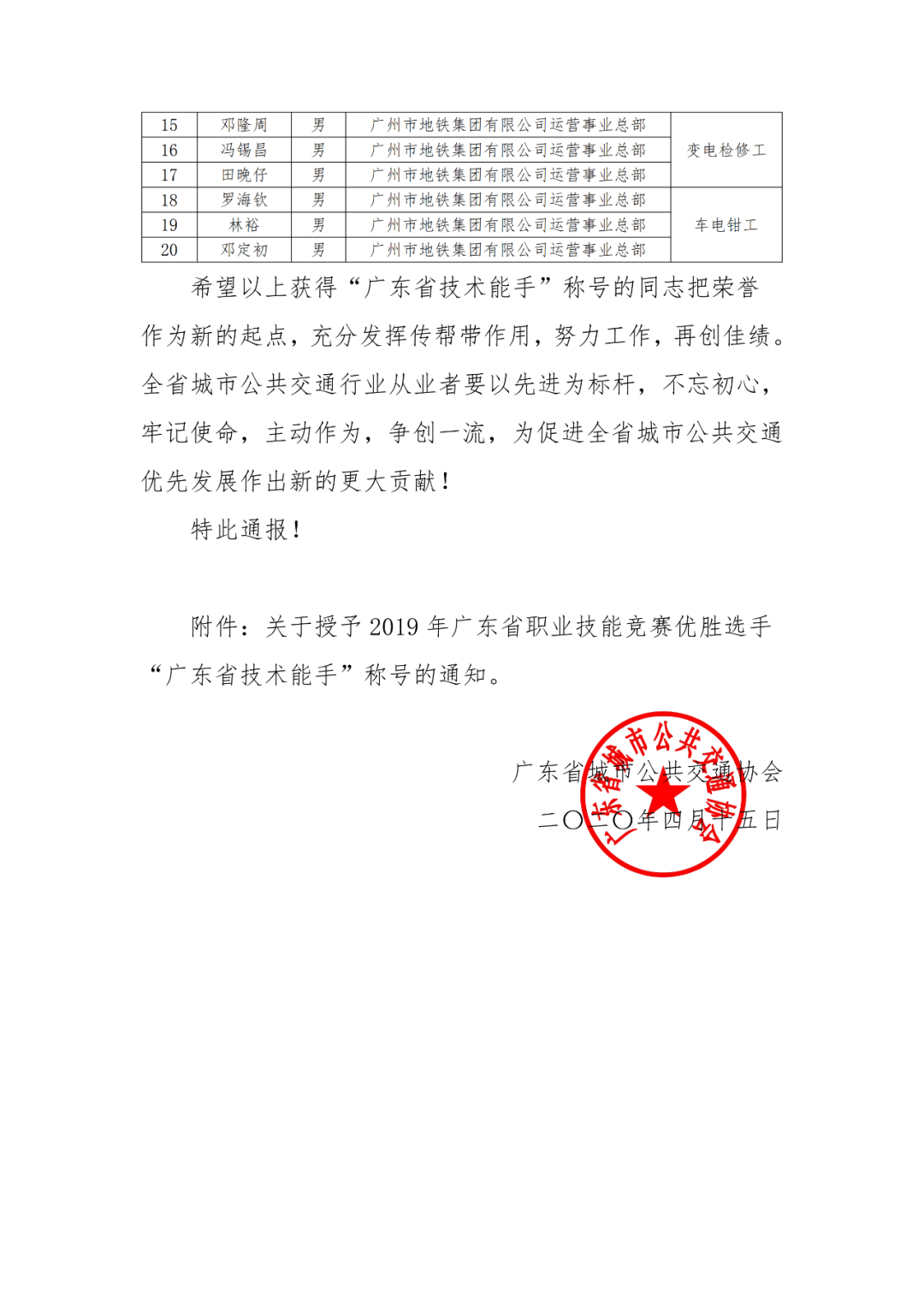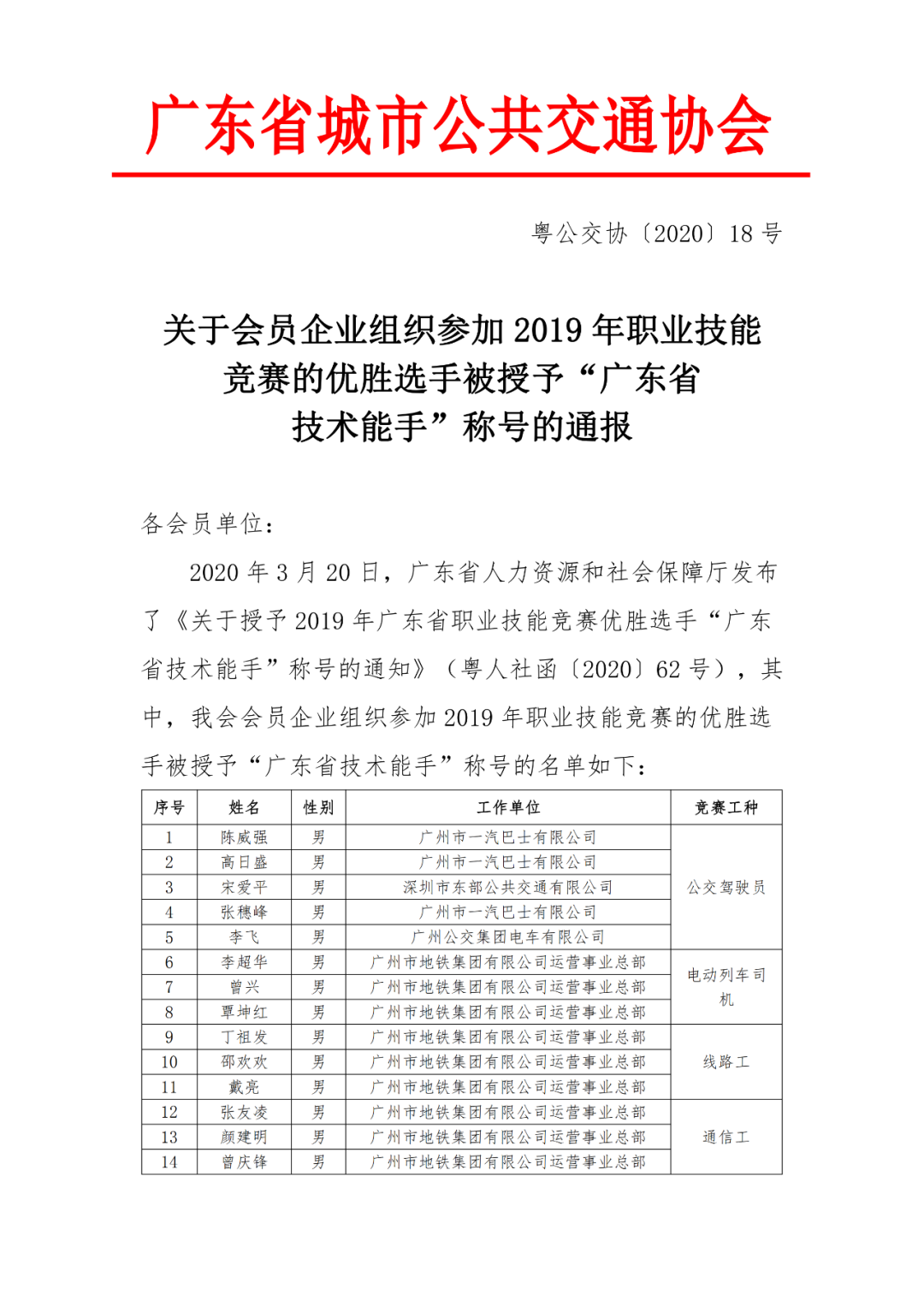 关于会员企业组织参加2019年职业技能竞赛的优胜选手被授予“广东省技术能手”称号的通报