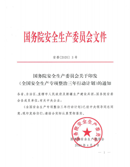 2020年4月1日,国务院安委会印发了《全国安全生产专项整治三年行动计划》,在全国部署开展安全生产专项整治三年计划。专项整治三年行动从2020年4月启动至2022年12月结束,分为动员部署、排查整治、集中攻坚和巩固提升四个阶段。
