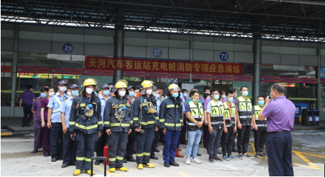 天河客运站充电桩给新能源车充电业务是今年来车站转型升级的创新业务,为建立完善该项业务服务的应急处理预案体系,进一步提高纯电动车充电自燃突发事件的处置能力,提高公司员工和合作单位人员的消防安全意识,真正把“预防为主、防消结合”的方针落到实处,提高自防自救的能力,结合站场生产实际情况,5月20日下午,天河客运站携手合作单位广州二运鑫粤新能源有限公司(天河充电站)组织开展了天河客运站充电桩消防专项应急演练。