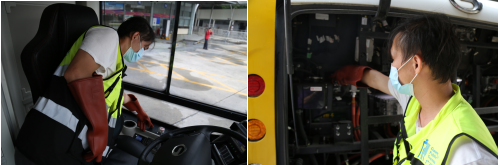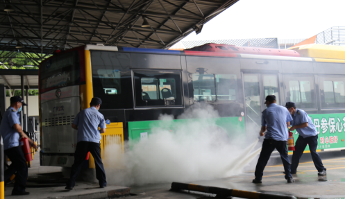 演练模拟开始,充电员像往常一样对正在车场充电桩补电的每一辆公交车实施安全巡查,当巡查至车场76号卡位充电桩时,发现正在补电的公交车辆电池仓突然冒出浓浓的白烟,充电员立即戴上绝缘手套切断充电桩及周边充电桩紧急按钮,拔出充电枪,跑上车辆断开车上低压电池仓开关,然后断开车上高压开关,按下车上“智能灭火器”开关,使用车上自动灭火装置对冒烟电池仓进行灭火;在此过程中,充电员向车站值勤人员大声呼叫“车辆起火了!”正在现场值岗的车场安监员闻声后立即通过对讲机向带班主任报告警情, 并呼叫附近各岗位工作人员,赶赴现场开展联合救援行动;救援疏散组组织人员疏散周边的人员和车辆,通知检票员关闭检票口,防止旅客和司乘人员进入改区域。