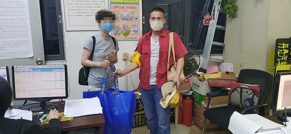 5月18日下午,市民侯女士在丹灶站务室领回自己的拎包并对佛广集团快08线公交车长王万玲连连赞扬,表示感谢。