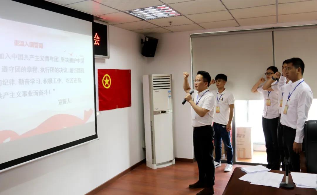 郑柔重同志带领全体团员面对团旗,重温入团誓词。