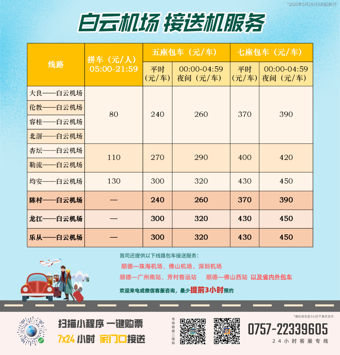 另为方便各镇街市民前往白云机场,避免中途转车,降低感染风险。顺德汽运集团增开陈村、龙江、乐从机场接送服务,并实现顺德十镇街全覆盖。全线采用5-7座新能源或高级商务车,实行24小时上门接送。预约上车时间,即可在家门口上下车,无需多次换乘,大大缩短乘车时间。关注“顺德汽运集团”官方微信公众号,点击下方菜单栏“白云机场”,即可预约。