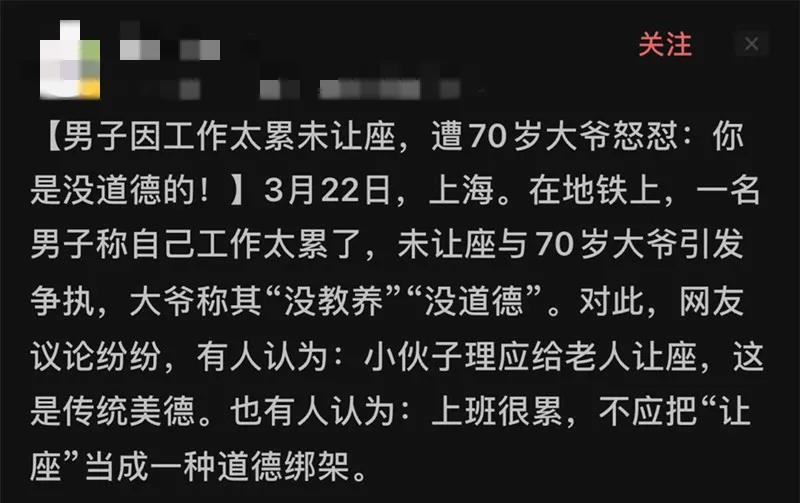 该短视频也引起网友热议,有部分网友表示,年轻人也不容易,需要理解。也有网友表示,让座是传统美德,但应该友好商量。