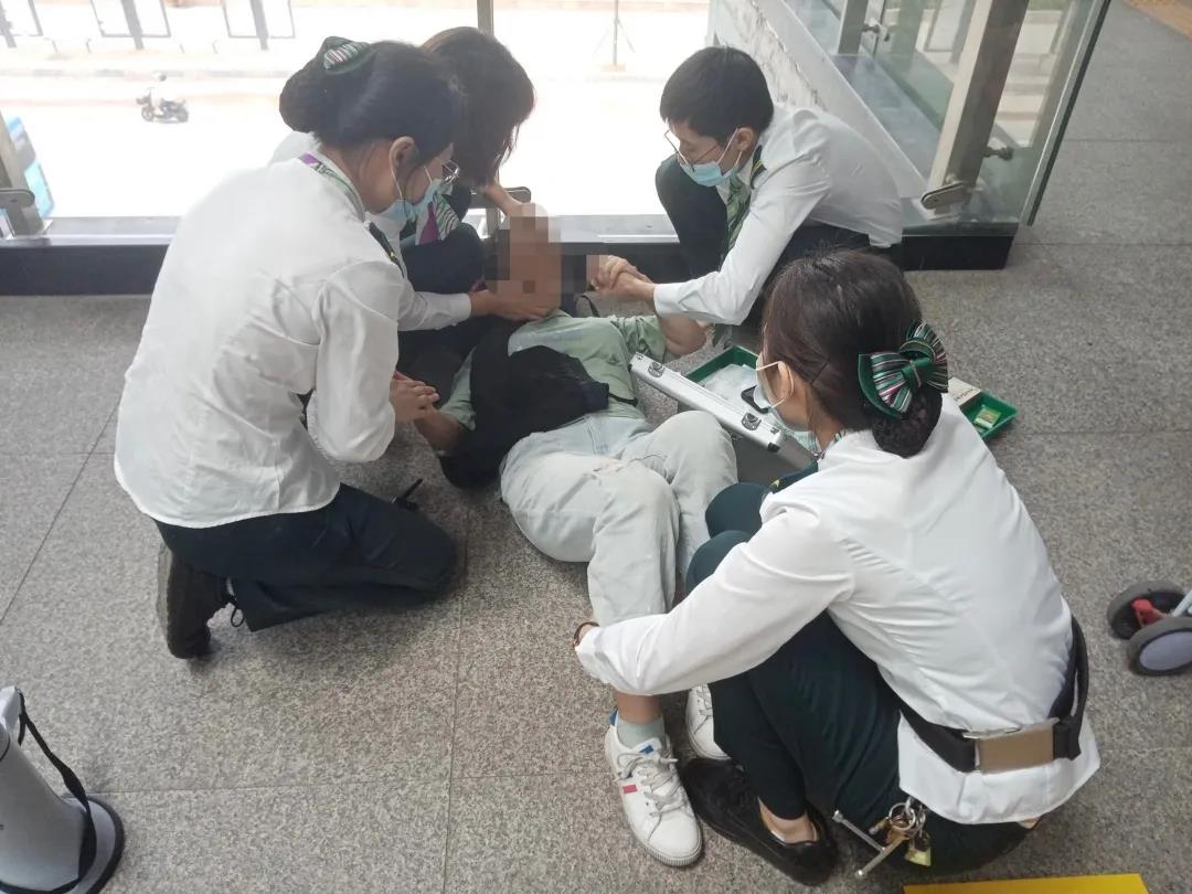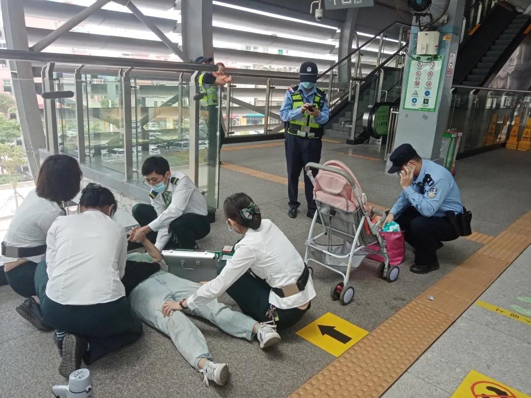 车站人员一直给乘客按摩,让乘客肌肉保持放松状态,试着帮助乘客恢复意识,并观察乘客脉搏及呼吸等情况。同时,安排人员照顾乘客小孩。经过车站人员的积极处置,乘客逐渐恢复意识。