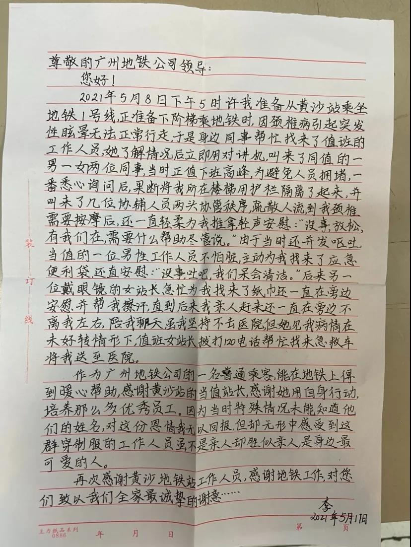 “不是亲人胜似亲人,是身边最可爱的人。”5月12日,一位女乘客给一号线黄沙站送了一封信,心中温暖的文字,让地铁员工非常感动。