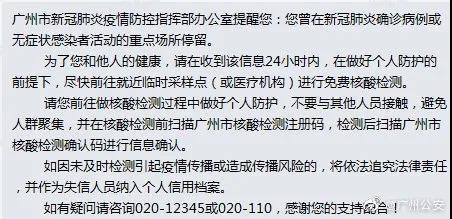 群众主要咨询其个人健康码为“绿码”,且近期已做过核酸检测,是否仍需进行检测?据广州市新冠肺炎疫情防控指挥部办公室回应:如群众本人的健康码为“绿码”,且收到短信前3天内已做好核酸检测,则不需要再检测;如群众近3天未做过核酸检测的,请在收到短信的24小时内尽快前往就近的采样点进行核酸检测。