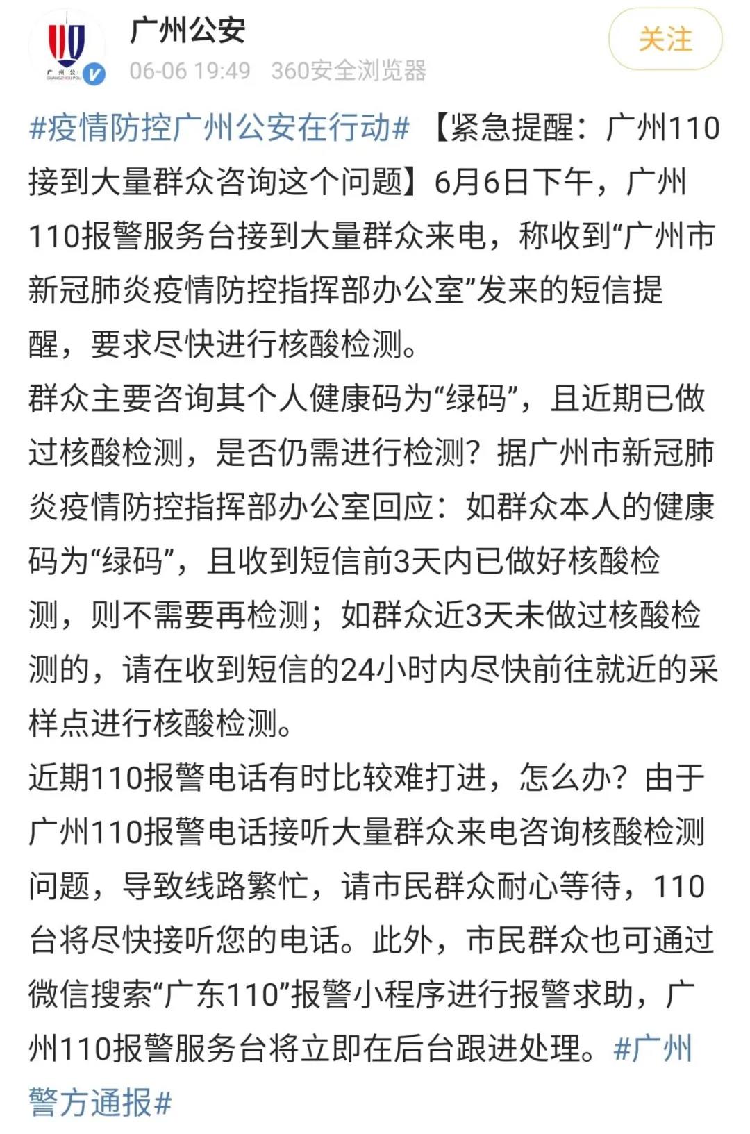今天(6月6日)下午,广州110报警服务台接到大量群众来电,称收到“广州市新冠肺炎疫情防控指挥部办公室”发来的短信提醒,要求尽快进行核酸检测。