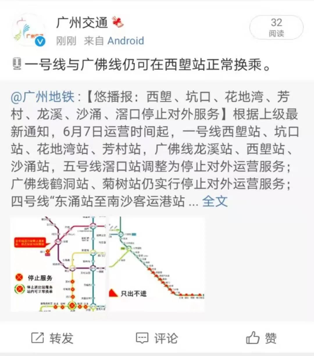 根据广州地铁最新通知,6月7日运营时间起,一号线西塱站、坑口站、花地湾站、芳村站,广佛线龙溪站、西塱站、沙涌站,五号线滘口站调整为停止对外运营服务;广佛线鹤洞站、菊树站仍实行停止对外运营服务;四号线“东涌站至南沙客运港站”各站所有出入口只出不进。一号线与广佛线仍可在西塱站正常换乘。