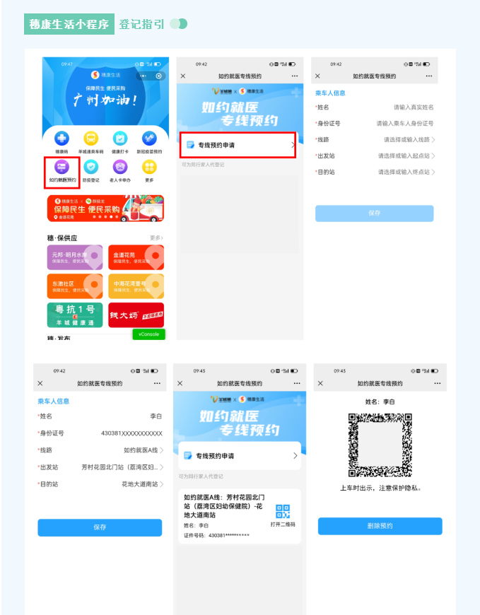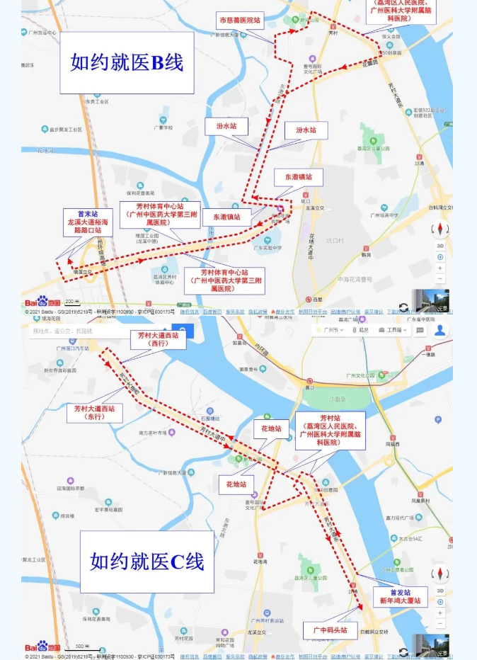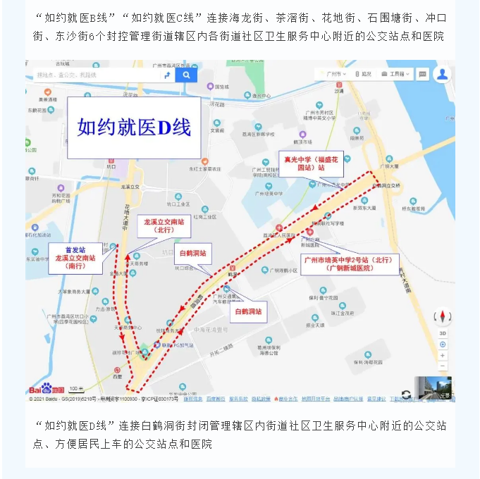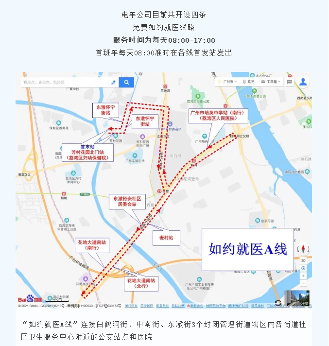 为解决疫情期间荔湾区芳村片区3个封闭管理街道和6个封控管理街道群众的就医问题,在荔湾区交通运输局和区卫生健康局指导下,广州公交集团统一部署,由电车公司从6月10日起开通4条如约就医公交线路。(点击查看《红色蒲公英突击队驻守荔湾管控区域,建立医疗救护通道!》)