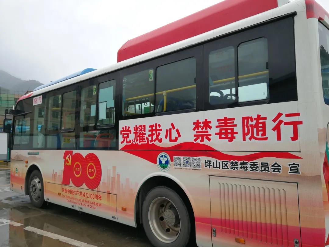 “换新装”后,“禁毒大巴”呈现以红色为主题的宣传走廊。其车身喷绘了鲜艳的“庆祝中国共产党成立100周年”“党耀我心 禁毒随行”广告标示及“禁毒公众号二维码”,广大市民乘客可以通过扫描车身上的“禁毒二维码”迅速参与到全民禁毒中来。