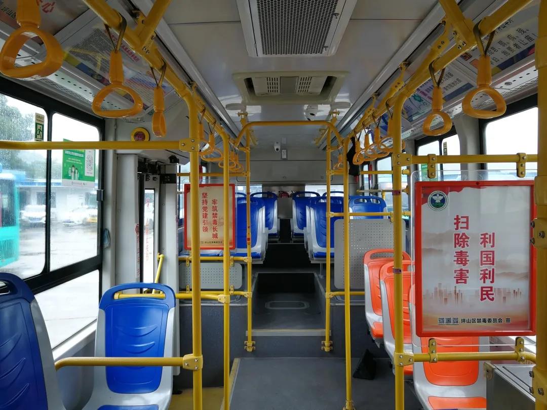 “禁毒巴士”的车厢内部设置了宣传广告栏,用以张贴禁毒宣传海报,专题介绍禁毒信息内容。此外,还有许多立意鲜明的禁毒标语,让乘客能够在享受便捷公交出行服务的同时,接受毒品预防宣传教育,提升广大乘客自我防范和自我保护意识,起到“润物细无声”的禁毒宣传效果。