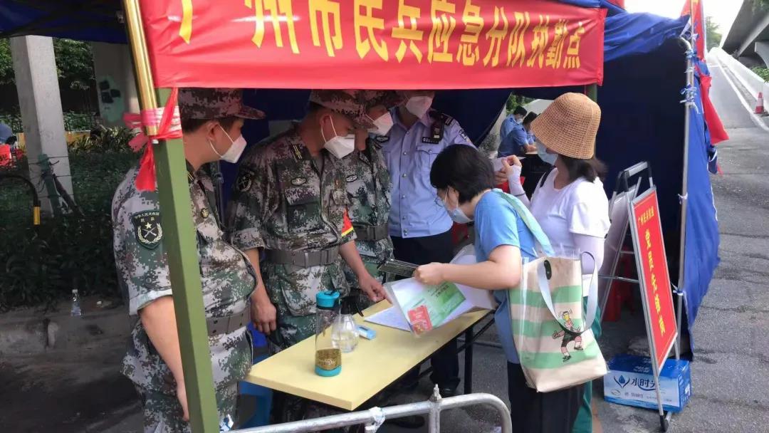 自6月19日起,广骏民兵已经连续奋战4个日夜,在珠江大桥执勤点全天候卡口封控、查验劝离、疫区巡逻、物资转运、维护秩序......尽管执勤工作24小时不间断,需要通宵达旦,但黄智琦、王菲从未退却。