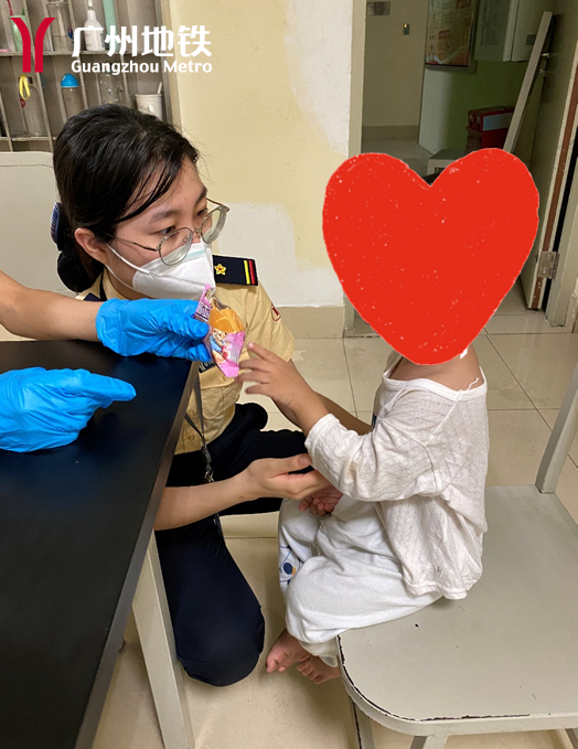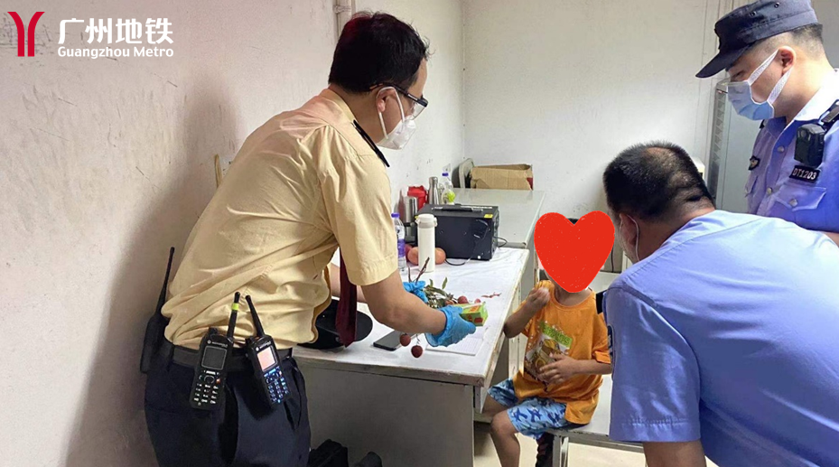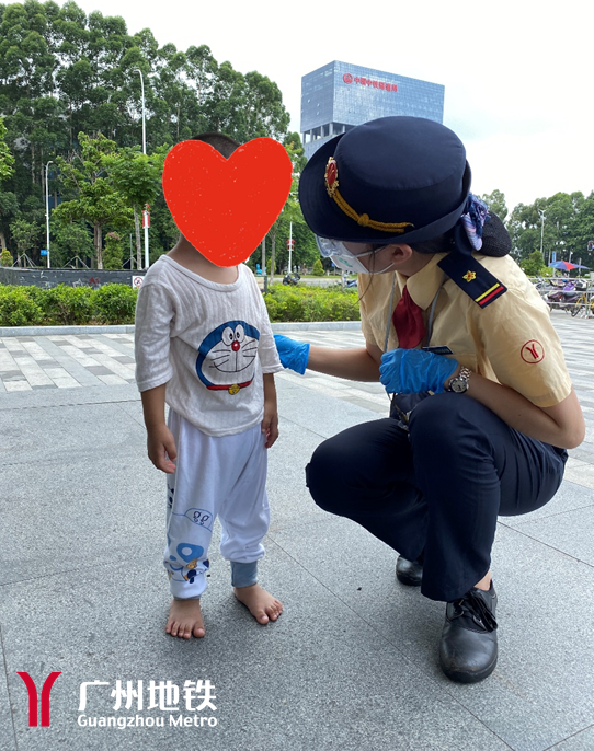 当天室外温度炎热,小男孩穿着尿不湿、赤着脚,除了喊“爸爸”什么也不会表达,显得特别的无助和害怕。闻讯赶来的站务员黄婉君蹲下身,温柔地安抚小男孩的情绪,并告诉他地铁站的叔叔阿姨及民警正在帮助寻找爸爸妈妈,小男孩紧张的情绪慢慢地放松了些。考虑到站外气温较高,黄德安排黄婉君带着小男孩先去检测体温,测温显示正常后将其带往车站内的休息室,自己则与车站辅警继续在出入口外四周寻找,等待小男孩的家人。