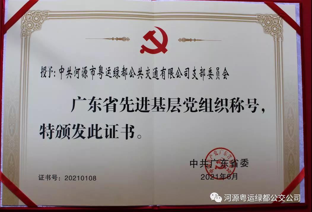 6月29日,在庆祝中国共产党成立100周年之际,为表彰先进、树立典型,推动形成见贤思齐、争做先锋的良好氛围,激励全省各级党组织和广大党员不忘初心、牢记使命,真抓实干、改革创新,不断开创广东工作新局面。广东省委以视频会议的形式召开了全省“两优一先”的表彰大会,河源粤运绿都公共交通有限公司党支部荣获“广东省先进基层党组织”荣誉称号,是河源市5个获评省先进基层党组织单位之一。
