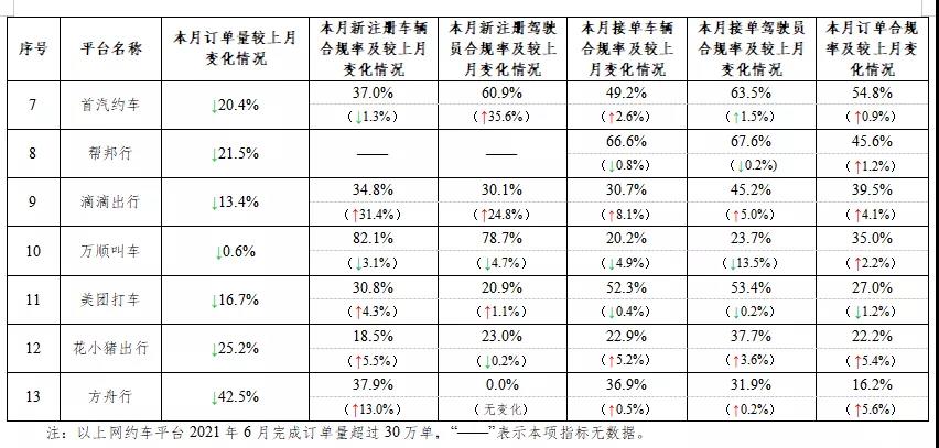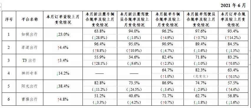 一、在订单量超过30万单的网约车平台中,订单合规率最高的是如祺出行,最低的是方舟行。2021年6月订单量超过30万单的网约车平台共13家。与5月份相比,招招出行、东风出行从5月订单量超过30万单降到30万单以下。按订单合规率(指驾驶员和车辆均获得许可的订单量占比)从高到低的分别是如祺出行、享道出行、T3出行、神州专车、阳光出行、曹操出行、首汽约车、帮邦行、滴滴出行、万顺叫车、美团打车、花小猪出行、方舟行。本月订单合规率增长排名前3名的分别是如祺出行、方舟行、花小猪出行;下降最多的分别是曹操出行、享道出行、美团打车。