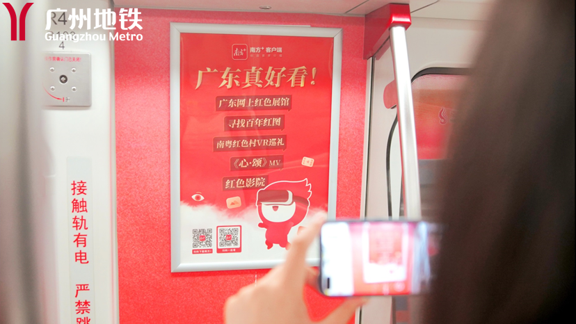 在杨箕站站厅、站台,灯箱、互动屏形成红色长廊,集中展示了南方报业传媒集团的红色精品,包括南方日报《恰是百年风华》建党百年献礼特刊、南方+客户端《心·颂》百人红歌联唱立体MV、南方杂志《南粤红色村VR巡礼》、南方网《党课开讲啦》短视频、南方农村报广东荔枝高铁专列红色之旅、南方周末《百年征途》系列报道,南方都市报、N视频《敬礼!我的党》百集青少年党史课等内容,同步展示了广东网上红色展馆、红色直播月等多样化产品。“坐地铁学党史,这种方式很好。”不少市民现场驻足体验、拍照留念。