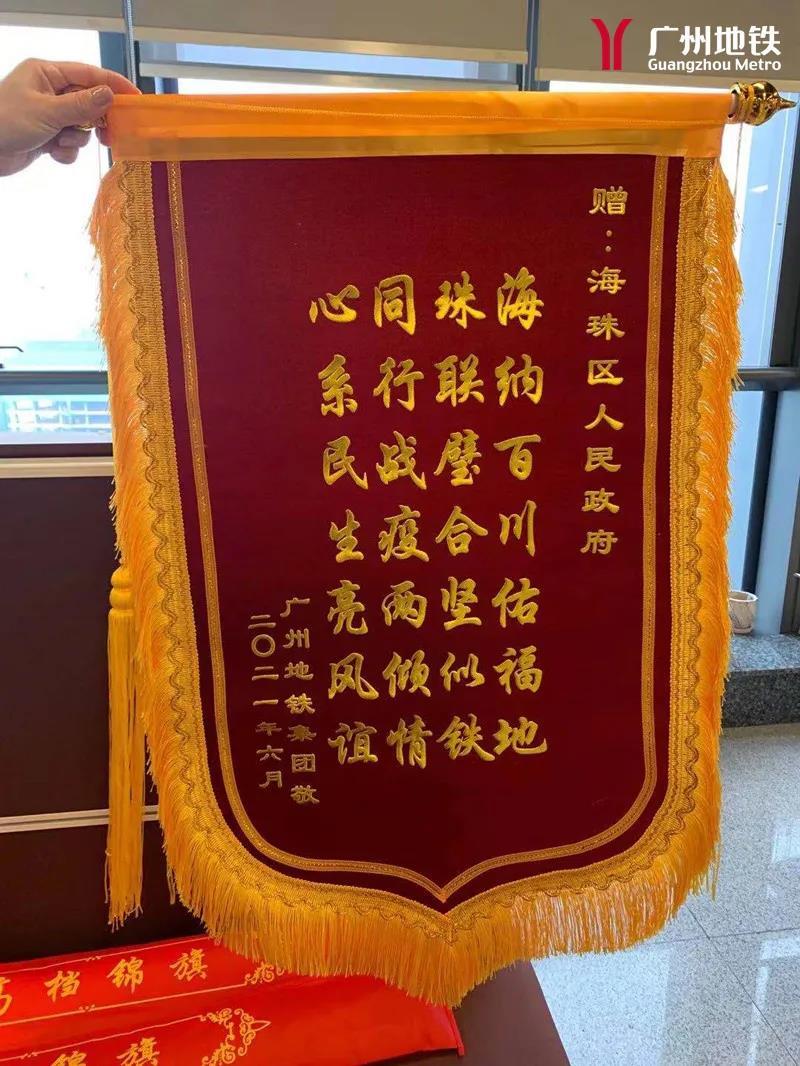 近日,广州地铁领导专程将印有“海纳百川佑福地,珠联璧合坚似铁,同行战疫两倾情,心系民生亮风谊”(藏头“海珠同心、地铁情谊”)的锦旗送到海珠区政府、海珠区卫健局,感谢区政府和区卫健局的倾心服务,帮助企业排忧解难,助力企业打好疫情防控攻坚战。