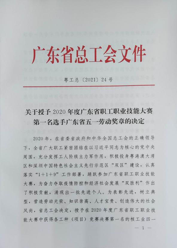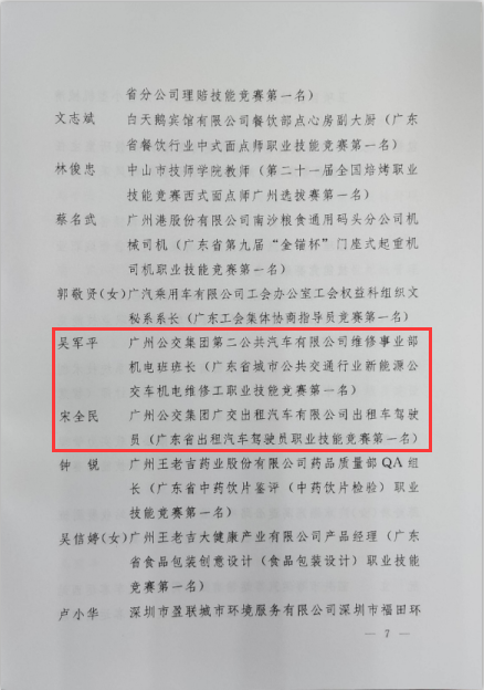近日,广东省总工会发文授予在2020年度广东省职工职业技能大赛“广东省城市公共交通行业新能源公交车机电维修工职业技能竞赛”和“广东省出租汽车驾驶员职业技能竞赛”中获得第一名的选手吴军平、宋全民“广东省五一劳动奖章”。