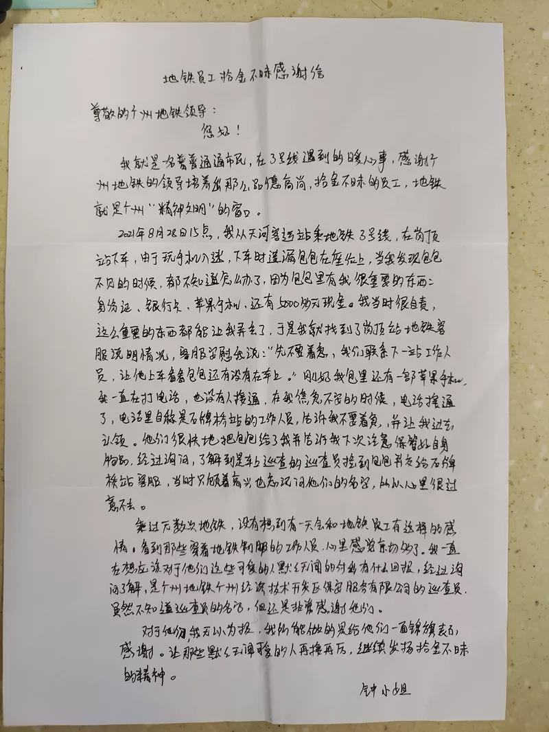 9月7日,一名乘客专程来到石牌桥站,向车站送上一面锦旗和一封感谢信,表示是受人委托到车站感谢车站工作人员10天前帮助寻回落在地铁上的双肩包这到底是怎么回事呢?