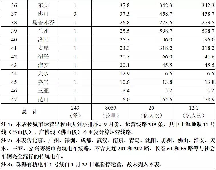 9月份,新增运营线路2条、运营区段1个、运营里程95.5公里,分别为广州地铁18号线首通段、哈尔滨地铁2号线一期、杭州地铁9号线一期北段。9月份,48个城市完成客运量环比增长2.4亿人次、增长13.6%,同比去年9月增长3.6亿人次、增长22%。因特大暴雨灾害停运的郑州地铁已于9月12日起陆续恢复运营。