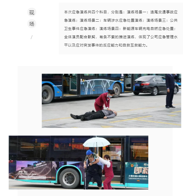演练现场,宝安区交通运输局科长梅红威、二分公司总经理刘毅刚、公司本部安全部副经理陈家练、二分公司安全总监、副总经理李湛新、二分公司安委会全体成员、各车队队长、修理厂厂长及各基层单位相关人员前来观演,共计185人。