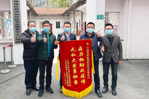 白云(广交)公司把一面绣有“鼎力相助战疫情,无私大爱勇担当”明黄大字的鲜红锦旗以及感谢信,交到医务人员手上,衷心感谢广州市海珠区琶洲街社区卫生服务中心的全体医务人员,用实际行动诠释为人民服务的初心使命,彰显抗击疫情的责任与担当,展现出医护人员的大爱无疆。