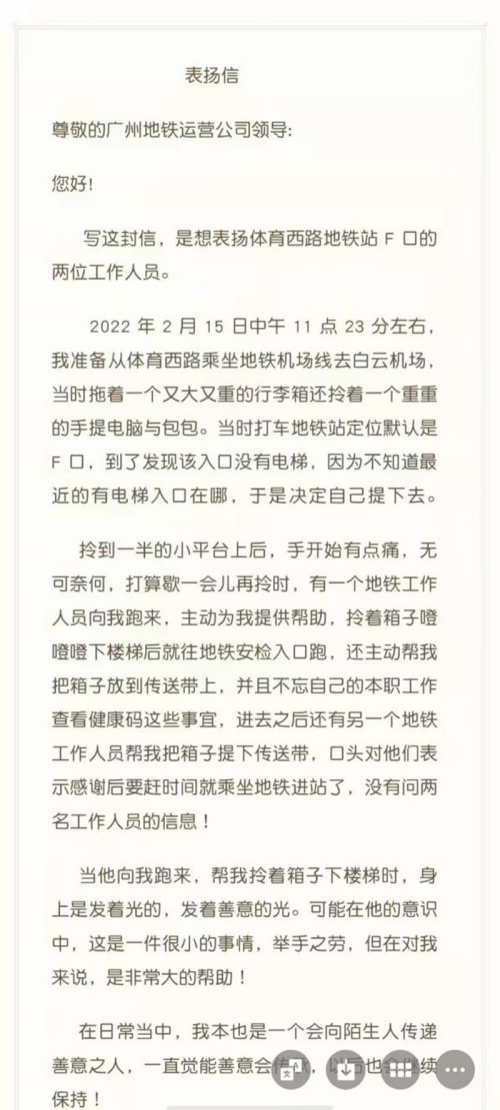 近日,一名乘客在微博上发了一封饱含真情的感谢信,特地向广州地铁体育西路站的两名安检小哥哥表示谢意,为广州地铁的真情服务点赞,背后到底发生了什么暖心故事呢?