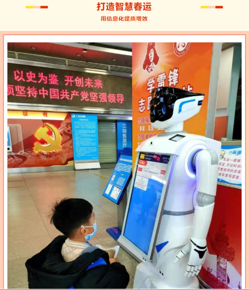 为推动科技服务交通,省站推出5G智能机器人服务春运,通过智能化、无人化服务实现了“智能防疫、科技防疫”;天河站、滘口站、广州南汽车站等投入大量自助设备,在自助报班、自助售票、自助查询等方面减少人与人之间接触,减少疫情传播风险。