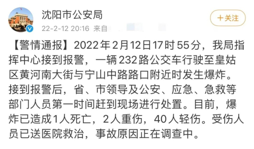 2 月 12 日,沈阳市一辆 232 路公交车在行驶至皇姑区黄河南大街与宁山中路路口附近时发生爆炸。爆炸发生时,有巨响和火光,事后公交车两侧的玻璃已基本碎裂,前挡风玻璃破损,车门变形无法打开,说明当时爆炸威力不小。这场爆炸导致 1 人死亡、2 人重伤、40 人受伤。