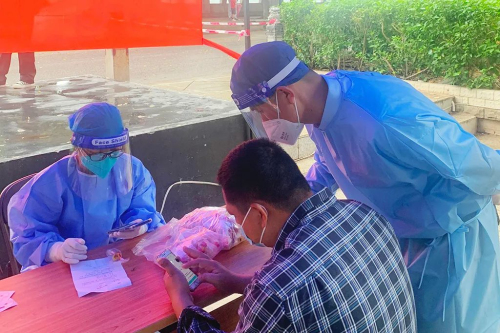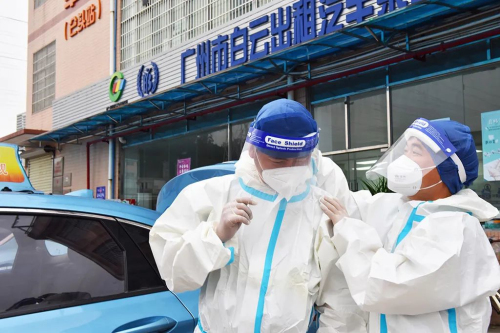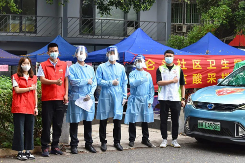 在仑头社区临时核酸检测点,白云(广交)公司青年团员杜韵、黄志鹏、谭展琮与青年“的哥”柳康开、王利、张广会等人穿起隔离服、防护服,协助做好7天内返穗、来穗,黄码或出入过重点场所的防疫重点人员的核酸检查工作。