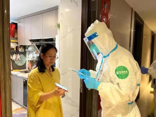 在坪山区龙田街道管控区,深铁抗疫先锋队龙田分队的党员干部身穿防护服,随时接收指令接待入住隔离人员,进行信息登记、安排入住,核对隔离和放行时间,分发食物、收集垃圾、消杀环境、运送物品,进行24小时值守。