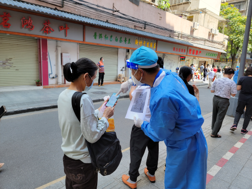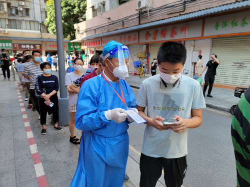 “大家排好队,扫我身上的二维码牌子进行登记,耐心等候、配合我们做好核酸检测工作,现在是防控的关键时候,要带好口罩、注意做好个人防护工作。”刚到白云区景泰街核酸检测点的段安春立马投入到疫情防控工作中。
